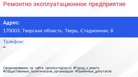 Ремонтно-эксплуатационное предприятие по адресу 170003, Тверская область, Тверь, Стадионная, 8 в дальнейшем Организация, размещена в следующих категориях: