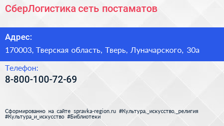 СберЛогистика, сеть постаматов по адресу 170003, Тверская область, Тверь, Луначарского, 30а в дальнейшем Организация, размещена в следующих категориях: