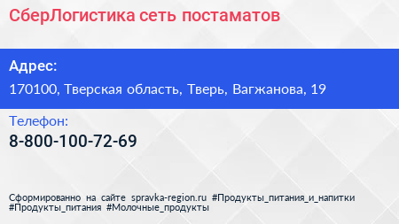 СберЛогистика, сеть постаматов по адресу 170100, Тверская область, Тверь, Вагжанова, 19 в дальнейшем Организация, размещена в следующих категориях: