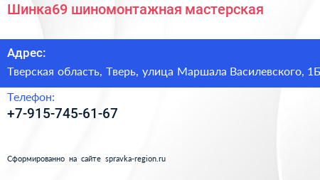Шинка69, шиномонтажная мастерская по адресу Тверская область, Тверь, улица Маршала Василевского, 1Б в дальнейшем Организация, размещена в следующих категориях: