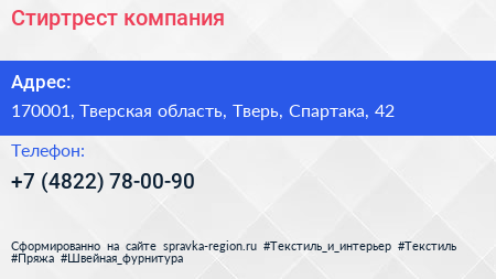 Стиртрест, компания по адресу 170001, Тверская область, Тверь, Спартака, 42 в дальнейшем Организация, размещена в следующих категориях: