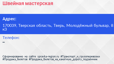 Швейная мастерская по адресу 170039, Тверская область, Тверь, Молодёжный бульвар, 8 к3 в дальнейшем Организация, размещена в следующих категориях: