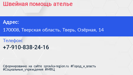 Швейная помощь, ателье по адресу 170008, Тверская область, Тверь, Озёрная, 14 в дальнейшем Организация, размещена в следующих категориях: