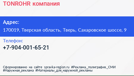 TONROHR, компания по адресу 170019, Тверская область, Тверь, Сахаровское шоссе, 9 в дальнейшем Организация, размещена в следующих категориях: