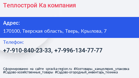 Теплострой-Ка, компания по адресу 170100, Тверская область, Тверь, Крылова, 7 в дальнейшем Организация, размещена в следующих категориях: