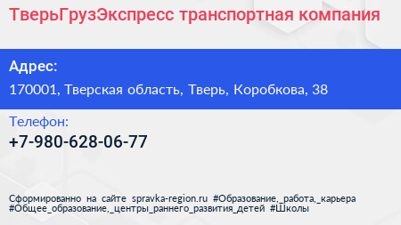 ТверьГрузЭкспресс, транспортная компания по адресу 170001, Тверская область, Тверь, Коробкова, 38 в дальнейшем Организация, размещена в следующих категориях: