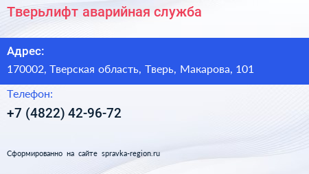 Тверьлифт, аварийная служба по адресу 170002, Тверская область, Тверь, Макарова, 101 в дальнейшем Организация, размещена в следующих категориях: