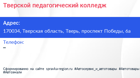 Тверской педагогический колледж по адресу 170034, Тверская область, Тверь, проспект Победы, 6а в дальнейшем Организация, размещена в следующих категориях: