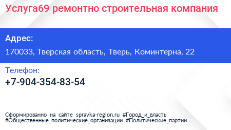 Услуга69, ремонтно-строительная компания по адресу 170033, Тверская область, Тверь, Коминтерна, 22 в дальнейшем Организация, размещена в следующих категориях: