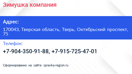 Зимушка, компания по адресу 170043, Тверская область, Тверь, Октябрьский проспект, 75 в дальнейшем Организация, размещена в следующих категориях: