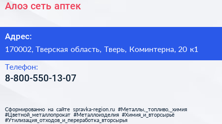 Алоэ, сеть аптек по адресу 170002, Тверская область, Тверь, Коминтерна, 20 к1 в дальнейшем Организация, размещена в следующих категориях: