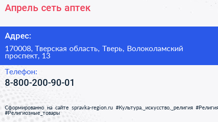 Апрель, сеть аптек по адресу 170008, Тверская область, Тверь, Волоколамский проспект, 13 в дальнейшем Организация, размещена в следующих категориях: