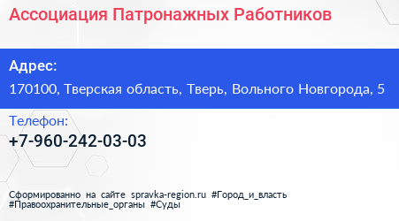 Ассоциация Патронажных Работников по адресу 170100, Тверская область, Тверь, Вольного Новгорода, 5 в дальнейшем Организация, размещена в следующих категориях: