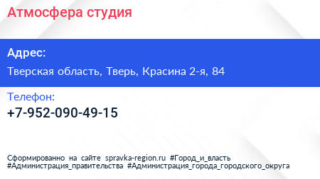 Атмосфера, студия по адресу Тверская область, Тверь, Красина 2-я, 84 в дальнейшем Организация, размещена в следующих категориях: