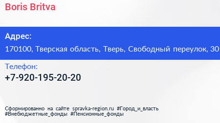 Boris Britva по адресу 170100, Тверская область, Тверь, Свободный переулок, 30 в дальнейшем Организация, размещена в следующих категориях: