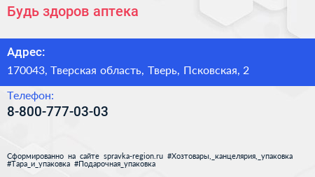 Будь здоров!, аптека по адресу 170043, Тверская область, Тверь, Псковская, 2 в дальнейшем Организация, размещена в следующих категориях: