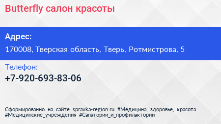 Butterfly, салон красоты по адресу 170008, Тверская область, Тверь, Ротмистрова, 5 в дальнейшем Организация, размещена в следующих категориях: