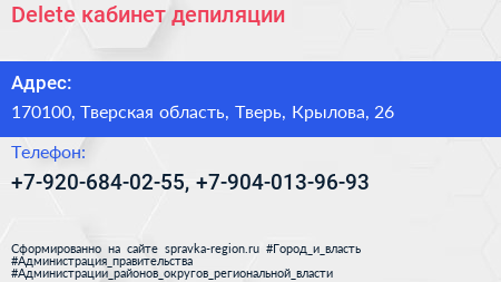 Delete, кабинет депиляции по адресу 170100, Тверская область, Тверь, Крылова, 26 в дальнейшем Организация, размещена в следующих категориях: