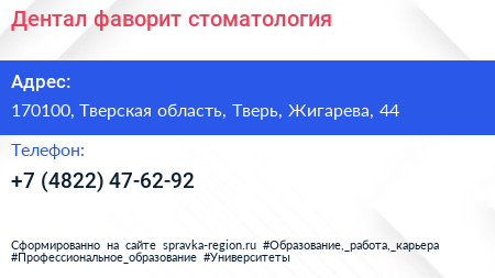 Дентал-фаворит, стоматология по адресу 170100, Тверская область, Тверь, Жигарева, 44 в дальнейшем Организация, размещена в следующих категориях: