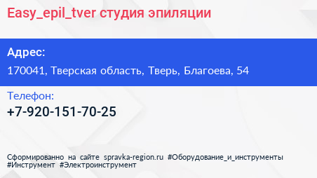 Easy_epil_tver, студия эпиляции по адресу 170041, Тверская область, Тверь, Благоева, 54 в дальнейшем Организация, размещена в следующих категориях:
