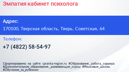 Эмпатия, кабинет психолога по адресу 170100, Тверская область, Тверь, Советская, 64 в дальнейшем Организация, размещена в следующих категориях: