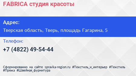 FABRICA, студия красоты по адресу Тверская область, Тверь, площадь Гагарина, 5 в дальнейшем Организация, размещена в следующих категориях: