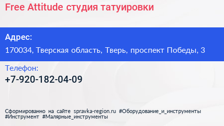 Free Attitude, студия татуировки по адресу 170034, Тверская область, Тверь, проспект Победы, 3 в дальнейшем Организация, размещена в следующих категориях: