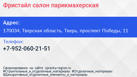 Фристайл, салон-парикмахерская по адресу 170034, Тверская область, Тверь, проспект Победы, 11 в дальнейшем Организация, размещена в следующих категориях: