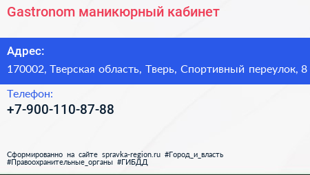 Gastronom, маникюрный кабинет по адресу 170002, Тверская область, Тверь, Спортивный переулок, 8 в дальнейшем Организация, размещена в следующих категориях: