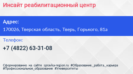 Инсайт, реабилитационный центр по адресу 170026, Тверская область, Тверь, Горького, 81а в дальнейшем Организация, размещена в следующих категориях: