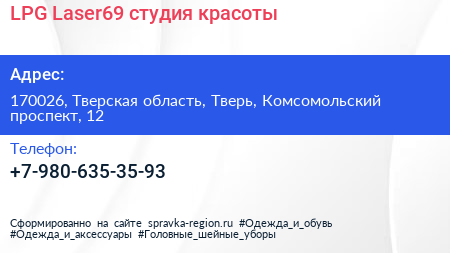 LPG-Laser69, студия красоты по адресу 170026, Тверская область, Тверь, Комсомольский проспект, 12 в дальнейшем Организация, размещена в следующих категориях: