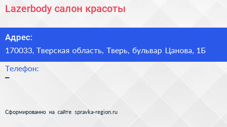 Lazerbody, салон красоты по адресу 170033, Тверская область, Тверь, бульвар Цанова, 1Б в дальнейшем Организация, размещена в следующих категориях: