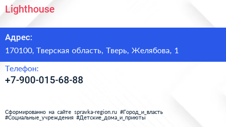 Lighthouse по адресу 170100, Тверская область, Тверь, Желябова, 1 в дальнейшем Организация, размещена в следующих категориях:
