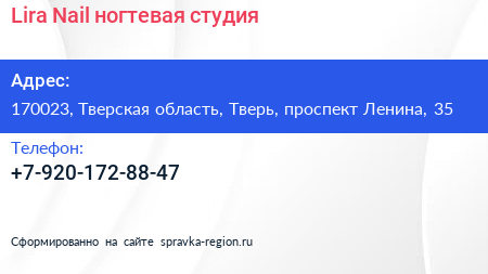 Lira Nail, ногтевая студия по адресу 170023, Тверская область, Тверь, проспект Ленина, 35 в дальнейшем Организация, размещена в следующих категориях: