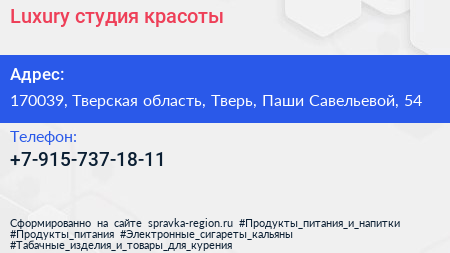 Luxury, студия красоты по адресу 170039, Тверская область, Тверь, Паши Савельевой, 54 в дальнейшем Организация, размещена в следующих категориях:
