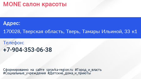MONE, салон красоты по адресу 170028, Тверская область, Тверь, Тамары Ильиной, 33 к1 в дальнейшем Организация, размещена в следующих категориях: