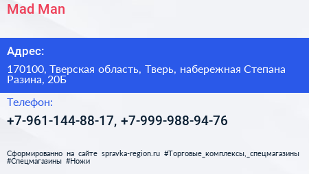 Mad Man по адресу 170100, Тверская область, Тверь, набережная Степана Разина, 20Б в дальнейшем Организация, размещена в следующих категориях:
