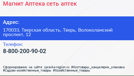 Магнит Аптека, сеть аптек по адресу 170033, Тверская область, Тверь, Волоколамский проспект, 12 в дальнейшем Организация, размещена в следующих категориях: