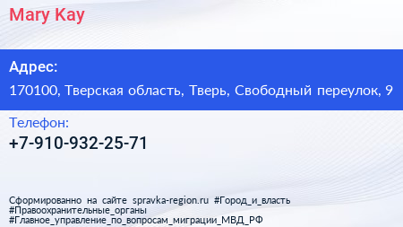 Mary Kay по адресу 170100, Тверская область, Тверь, Свободный переулок, 9 в дальнейшем Организация, размещена в следующих категориях: