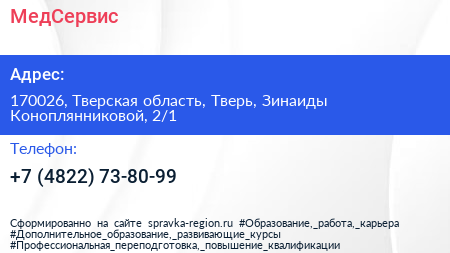 МедСервис по адресу 170026, Тверская область, Тверь, Зинаиды Коноплянниковой, 2/1 в дальнейшем Организация, размещена в следующих категориях: