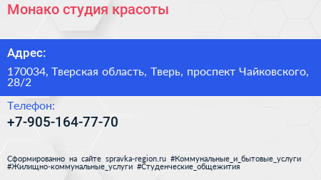 Монако, студия красоты по адресу 170034, Тверская область, Тверь, проспект Чайковского, 28/2 в дальнейшем Организация, размещена в следующих категориях: