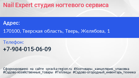 Nail Expert, студия ногтевого сервиса по адресу 170100, Тверская область, Тверь, Желябова, 1 в дальнейшем Организация, размещена в следующих категориях: