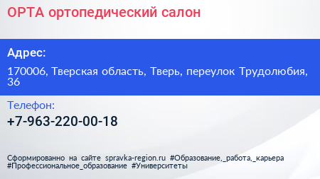ОРТА, ортопедический салон по адресу 170006, Тверская область, Тверь, переулок Трудолюбия, 36 в дальнейшем Организация, размещена в следующих категориях: