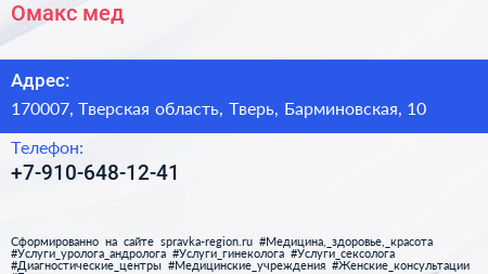 Омакс мед по адресу 170007, Тверская область, Тверь, Барминовская, 10 в дальнейшем Организация, размещена в следующих категориях:
