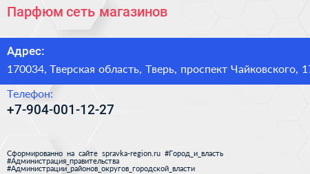 Парфюм, сеть магазинов по адресу 170034, Тверская область, Тверь, проспект Чайковского, 17 в дальнейшем Организация, размещена в следующих категориях: