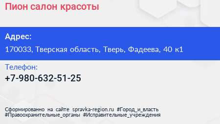 Пион, салон красоты по адресу 170033, Тверская область, Тверь, Фадеева, 40 к1 в дальнейшем Организация, размещена в следующих категориях: