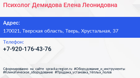 Психолог Демидова Елена Леонидовна по адресу 170021, Тверская область, Тверь, Хрустальная, 37 в дальнейшем Организация, размещена в следующих категориях: