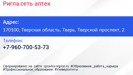 Ригла, сеть аптек по адресу 170100, Тверская область, Тверь, Тверской проспект, 2 в дальнейшем Организация, размещена в следующих категориях: