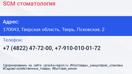 SCM, стоматология по адресу 170043, Тверская область, Тверь, Псковская, 2 в дальнейшем Организация, размещена в следующих категориях: