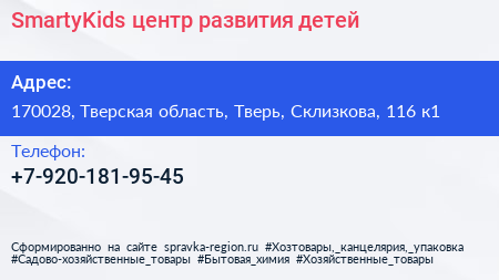 SmartyKids, центр развития детей по адресу 170028, Тверская область, Тверь, Склизкова, 116 к1 в дальнейшем Организация, размещена в следующих категориях: